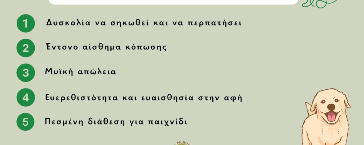 Τα πιο συχνά σημάδια είναι δυσκολία στο περπάτημα, μειωμένη διάθεση για παιχνίδι, ευερεθιστότητα όταν τον αγγίζετε και εμφανής κόπωση. Αν παρατηρήσετε τέτοιες αλλαγές, καλό είναι να επισκεφθείτε κτηνίατρο.