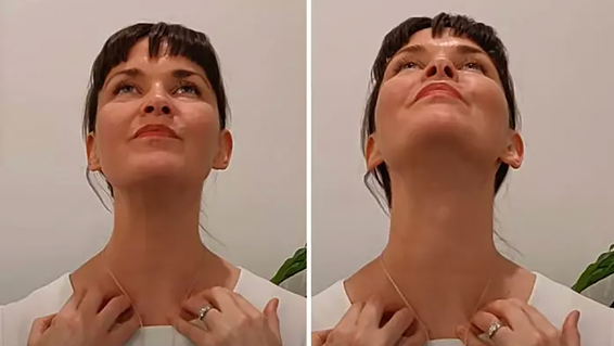 Κλίνετε ελαφρώς το πρόσωπό σας προς τα πάνω, στη συνέχεια ανυψώστε το πηγούνι σας προς τα πάνω και προς τα εμπρός σε γωνία 45 μοιρών, κρατώντας εκεί για 3 δευτερόλεπτα, πάνω από τον έναν ώμο.